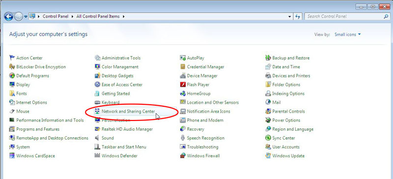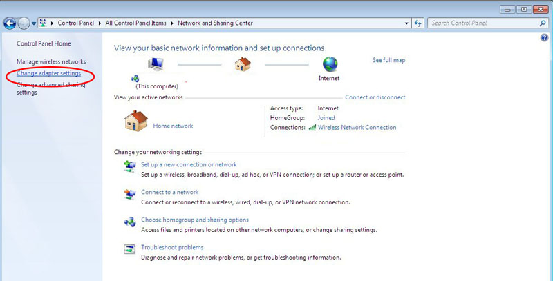 2. Klik Network dan Internet, kemudian Network and Sharing Center, dan klik Change adapter settings.